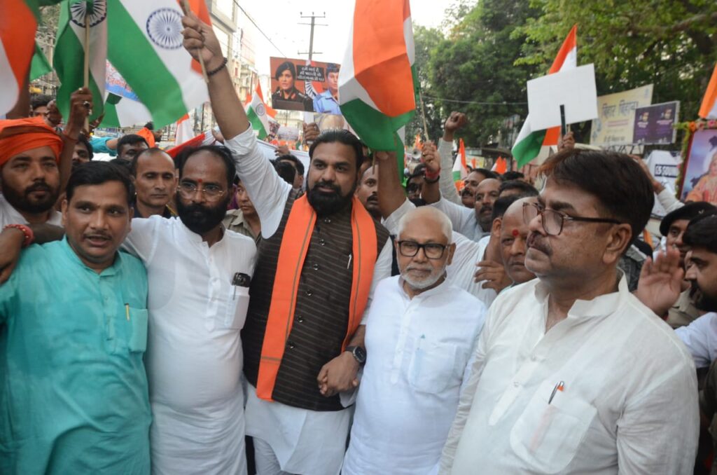 खबर एक्सप्रेस बिहार न्यूज24,पटना (बिहार) : भारतीय सेना के शौर्य, पराक्रम और वीरता के समर्थन में बिहार भाजपा ने आज एसपी वर्मा रोड स्थित महाराणा प्रताप की प्रतिमा से लेकर कारगिल चौक तक भव्य तिरंगा यात्रा निकाली। भाजपा अध्यक्ष डॉ. दिलीप जायसवाल की अगुवाई में निकाली गई इस तिरंगा यात्रा में भारतीय सेना के समर्थन में गगनभेदी नारे लगाए गए और पाकिस्तान की नापाक हरकतों के खिलाफ सेना के समर्थन में उनकी शौर्यगाथ को रेखांकित किया गया।